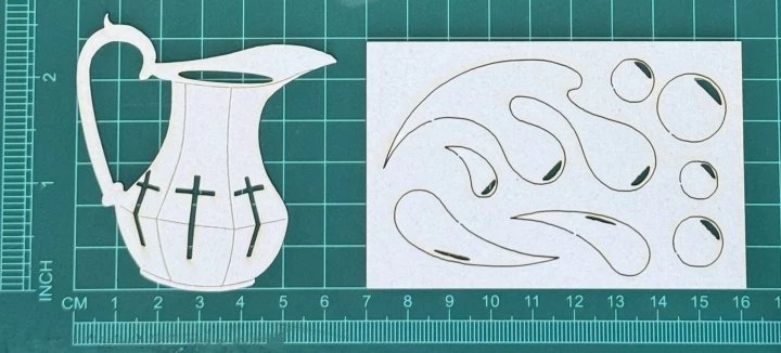 Dzban do chrztu z kroplami wody Scrapek - tekturka wycięty laserem z beermaty o grubości 1,5 mm. Wymiary jak na zdjęciu. Kod produktu to: LBA00889