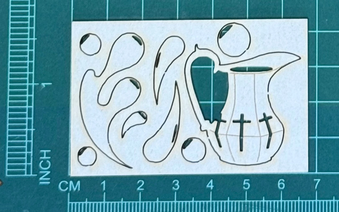 Dzbanek do chrztu z kroplami wody Scrapek - tekturka wycięty laserem z beermaty o grubości 1,5 mm. Wymiary jak na zdjęciu. Kod produktu to: LBA00941