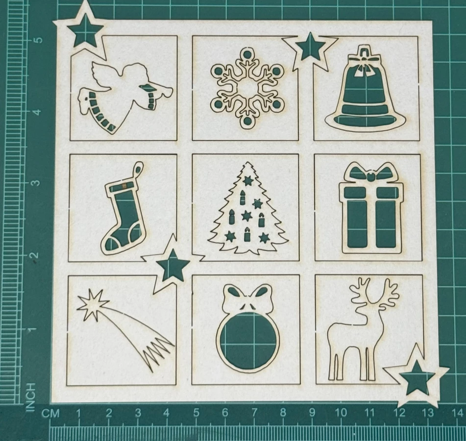 Elementy świąteczne w okienkach Scrapek - tekturka wycięty laserem z beermaty o grubości 1,5 mm. Wymiary jak na zdjęciu. Kod produktu to: LBA00628