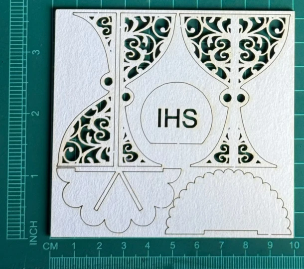 Kielich komunijny 3d połówka Scrapek - tekturka wycięty laserem z beermaty o grubości 1,5 mm. Wymiary jak na zdjęciu. Kod produktu to: LBA01250