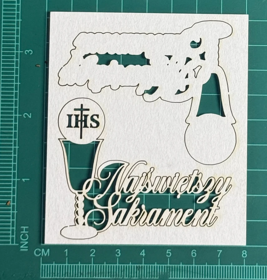 Kielich z napisem najświętrzy sakrament 2d Scrapek - tekturka wycięty laserem z beermaty o grubości 1,5 mm. Wymiary jak na zdjęciu. Kod produktu to: LBA01211