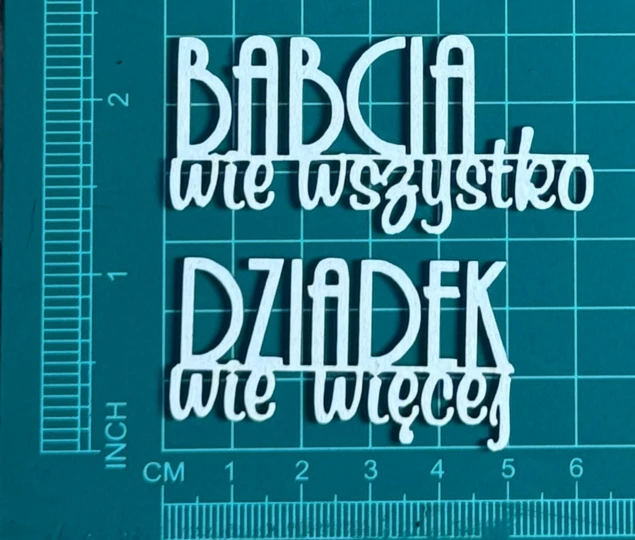 Napis Babcia wie wszystko dziadek Scrapek - tekturka wycięty laserem z beermaty o grubości 1,5 mm. Wymiary jak na zdjęciu. Kod produktu to: LBA01144