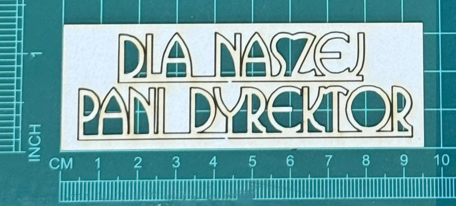 Napis Dla naszej Pani Dyrektor Scrapek - tekturka wycięty laserem z beermaty o grubości 1,5 mm. Wymiary jak na zdjęciu. Kod produktu to: LBA00502