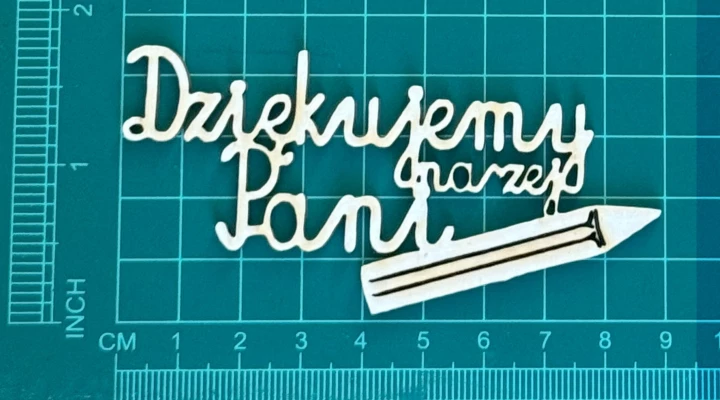 Napis Dziękujemy naszej Pani z ołówkiem Scrapek - tekturka wycięty laserem z beermaty o grubości 1,5 mm. Wymiary jak na zdjęciu. Kod produktu to: LBA00552