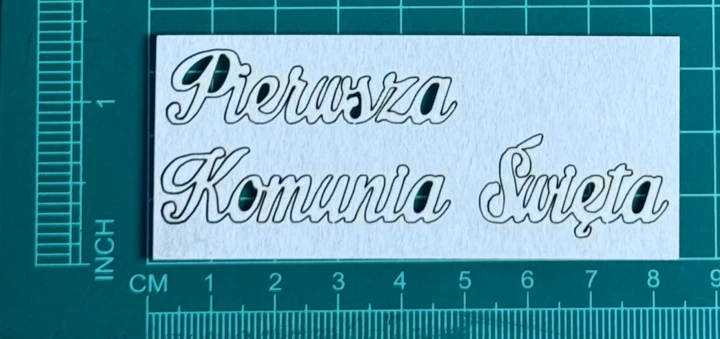 Napis Pierwsza Komunia Święta Scrapek - tekturka wycięty laserem z beermaty o grubości 1,5 mm. Wymiary jak na zdjęciu. Kod produktu to: LBA01099
