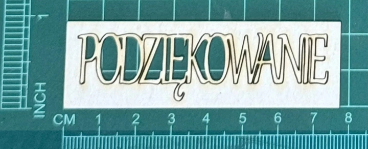 Napis Podziękowanie Scrapek - tekturka wycięty laserem z beermaty o grubości 1,5 mm. Wymiary jak na zdjęciu. Kod produktu to: LBA00763