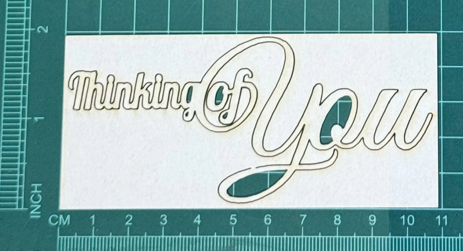 Napis Thinking of you Scrapek - tekturka wycięty laserem z beermaty o grubości 1,5 mm. Wymiary jak na zdjęciu. Kod produktu to: LBA00782