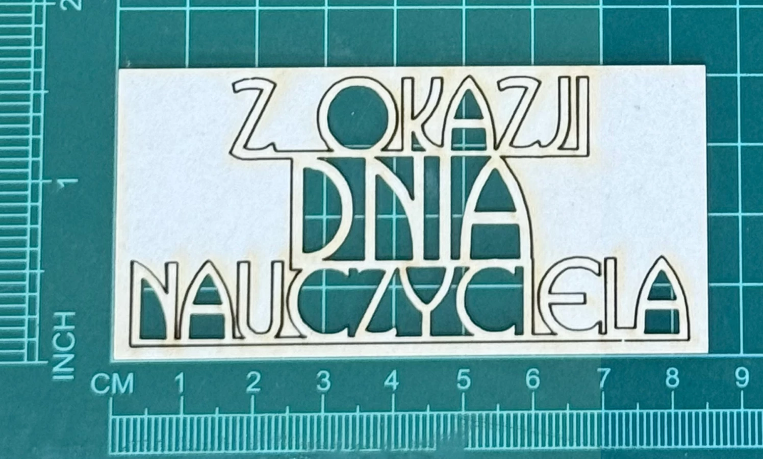 Napis Z okazji Dnia Nauczyciela Scrapek - tekturka wycięty laserem z beermaty o grubości 1,5 mm. Wymiary jak na zdjęciu. Kod produktu to: LBA00500