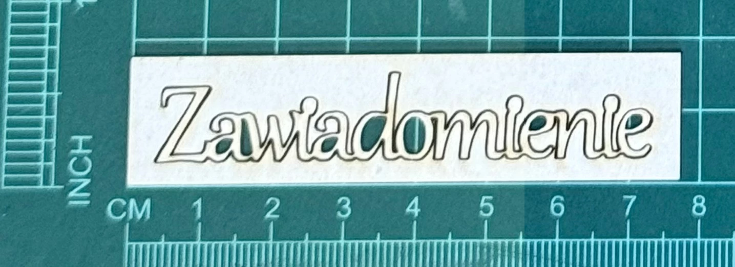 Napis Zawiadomienie Scrapek - tekturka wycięty laserem z beermaty o grubości 1,5 mm. Wymiary jak na zdjęciu. Kod produktu to: LBA00764