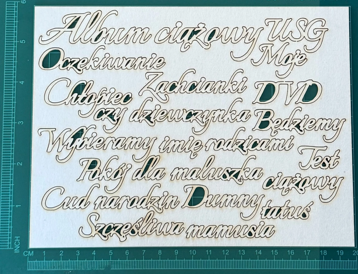 Napisy na Album Ciążowy Scrapek - tekturka wycięty laserem z beermaty o grubości 1,5 mm. Wymiary jak na zdjęciu. Kod produktu to: LBA00897