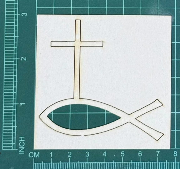 Rybka z krzyżem Scrapek - tekturka wycięty laserem z beermaty o grubości 1,5 mm. Wymiary jak na zdjęciu. Kod produktu to: LBA00979