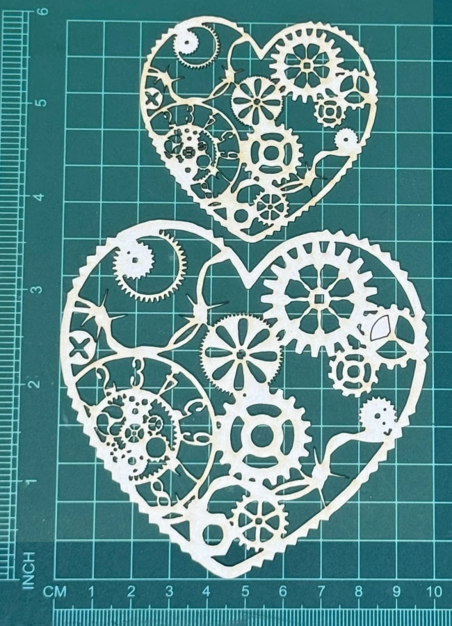Serca z trybikami 2 szt Scrapek - tekturka wycięty laserem z beermaty o grubości 1,5 mm. Wymiary jak na zdjęciu. Kod produktu to: LBA00539