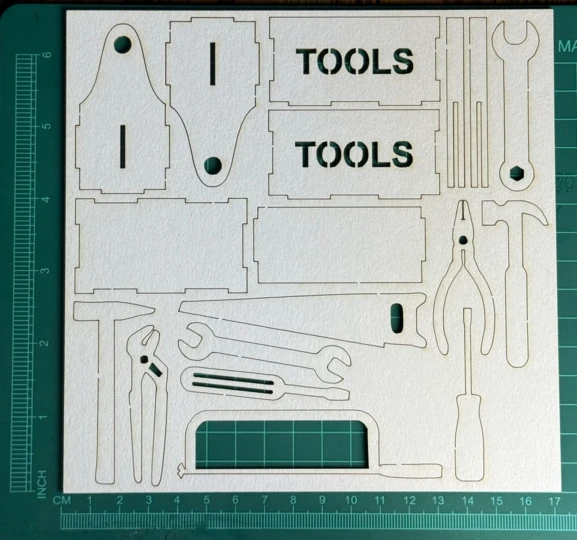 Skrzynka z narzędziami Scrapek - tekturka wycięty laserem z beermaty o grubości 1,5 mm. Wymiary jak na zdjęciu. Kod produktu to: LBA01278