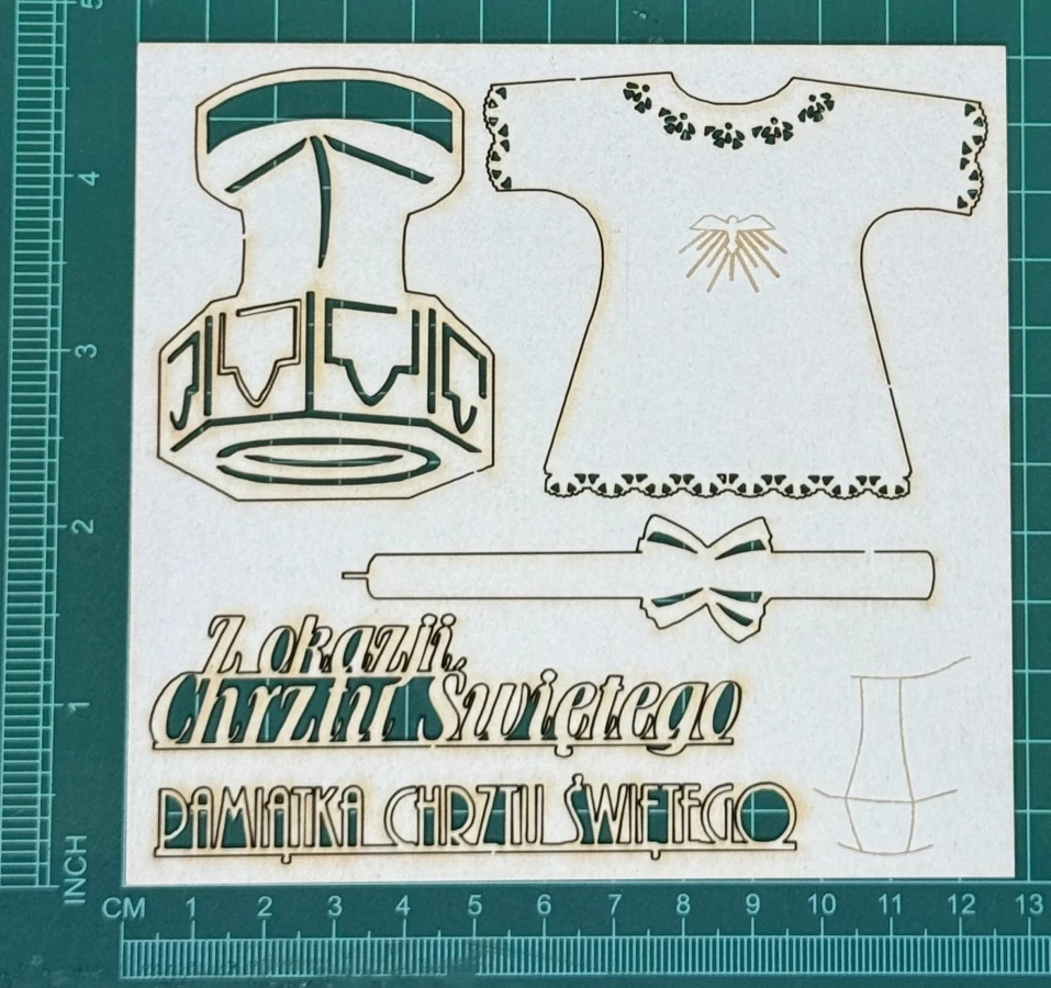 Zestaw do chrztu Scrapek - tekturka wycięty laserem z beermaty o grubości 1,5 mm. Wymiary jak na zdjęciu. Kod produktu to: LBA00904