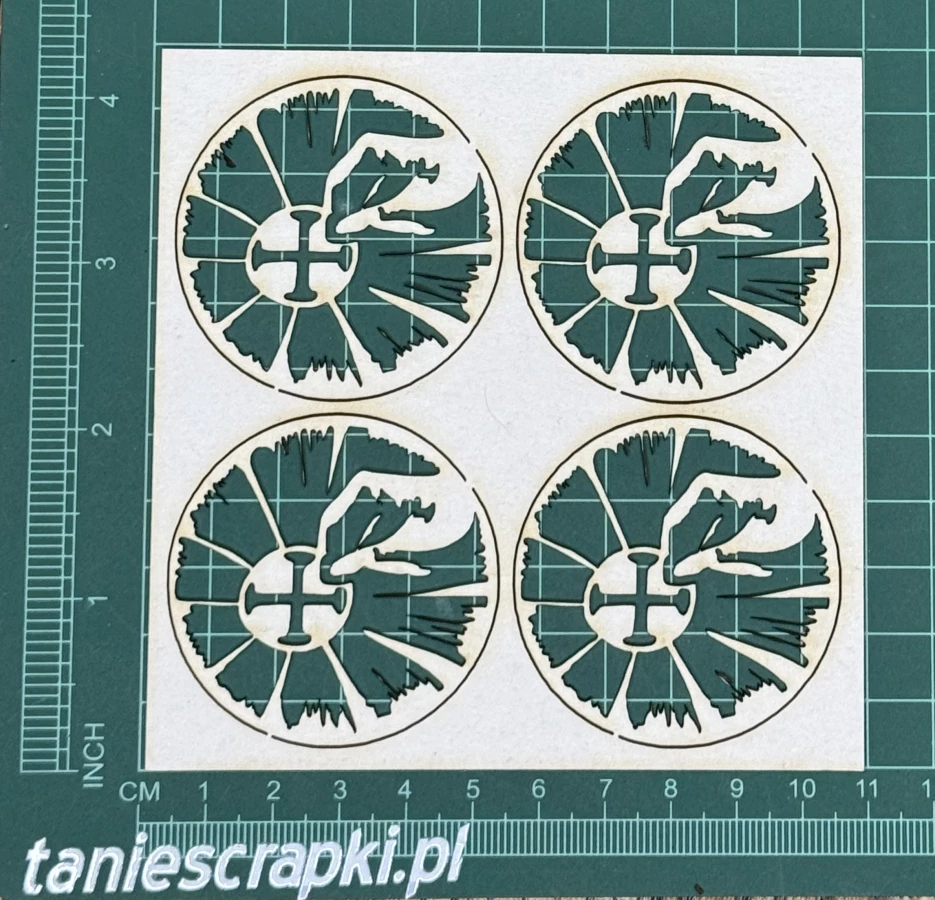 Zestaw Hostii Komunijnych Scrapek - tekturka wycięty laserem z beermaty o grubości 1,5 mm. Wymiary jak na zdjęciu. Kod produktu to: LBA00376