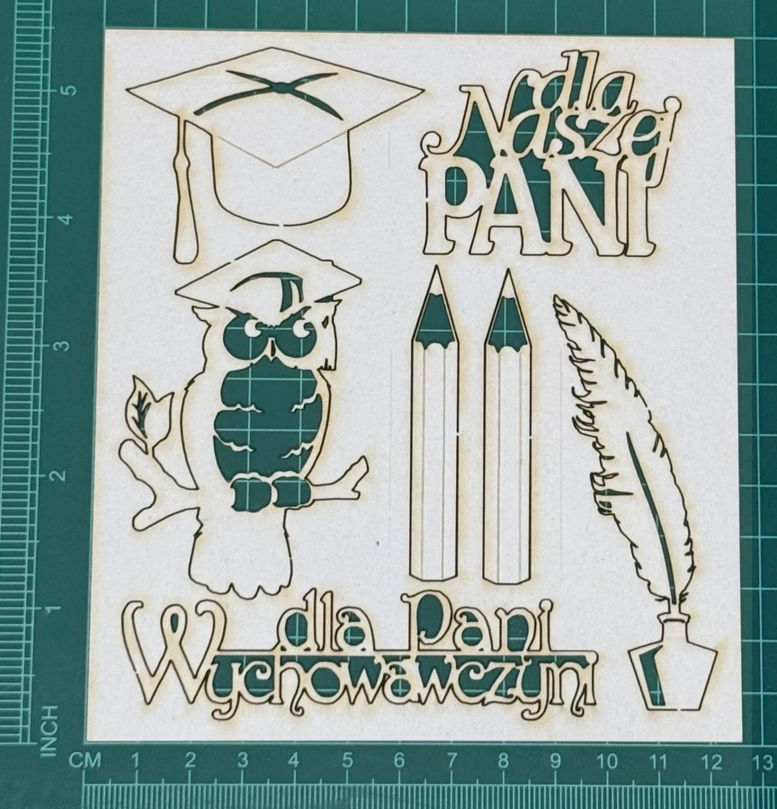 Zestaw szkolny sowa, bireta, ołowki, pióro, napis Dla naszej pani Scrapek - tekturka wycięty laserem z beermaty o grubości 1,5 mm. Wymiary jak na zdjęciu. Kod produktu to: LBA00481