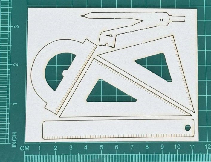 Zewstaw geometryczny linijka ekierka cyrkiel i kontomierz Scrapek - tekturka wycięty laserem z beermaty o grubości 1,5 mm. Wymiary jak na zdjęciu. Kod produktu to: LBA00483