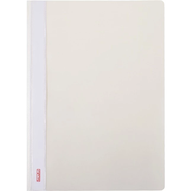 Folia PVC, przód miękki przezroczysty, tył twardy kolorowy; w środku blaszka i wąs o długości 16,5 cm, umożliwiający wpięcie dokumentów do 2 cm; wymienny papierowy pasek do opisu; dwa wycięcia ułatwiające wysuwanie paska; zaokrąglone rogi obu okładek;
