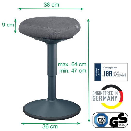 Ten ergonomiczny stolek z regulacją wysokości, opracowany zostal we wspólpracy z Instytutem Zdrowia i Ergonomii (IGR) w celu zapewnienia aktywności podczas siedzenia przy biurku w domu lub w pracy.