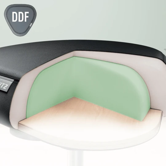 - Komfortowe trójkątne siedzisko z pianki o podwójnej gęstości (DDF), z solidnym, ergonomicznie ukształtowanym rdzeniem, rozkłada ciężar ciała równomiernie na całej miednicy, a otaczająca je wyściółka z miękkiej pianki zmniejsza nacisk na uda i nogi.