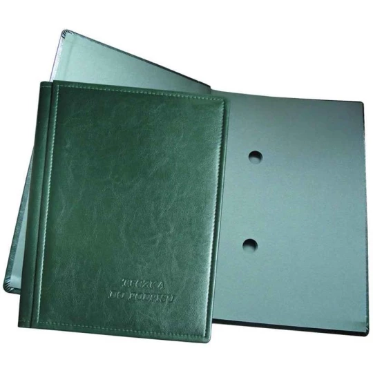 - Wymiary 240x330 mm, przeznaczona na dokumenty formatu A4. - Okladka oprawiona w miekką okleine skóropodobną, uwypuklona gąbką. - Na okladce umieszczony jest nadruk wykonany metodą suchego tloku. - Grzbiet kryty o szerokości ok. 17 mm. - Blok z kartonu barwionego w masie o gramaturze 400 g/m2. - Wewnątrz 10 kart z 2 otworami o średnicy 20 mm. Ulatwia to segregowanie, grupowanie i odnajdywanie dokumentów. - Posiada wyciete u dolu korytarze (poza pierwszą kartą).