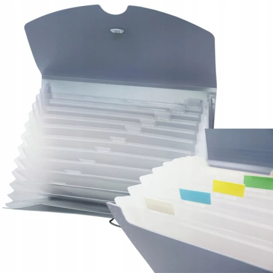 - wyposażona w 13 przegródek oddzielonych registrami z wymiennymi kolorowymi etykietami dla łatwiejszej organizacji dokumentów