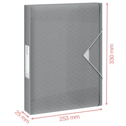 Grzbiet o szerokości 25 mm pozwala pomieścic do 200 kartek A4 (80 g/m?), a latwe w uzyciu elastyczne zamkniecie zabezpiecza zawartośc podczas przenoszenia. Na grzbiecie znajduje sie etykieta do opisu zawartości.