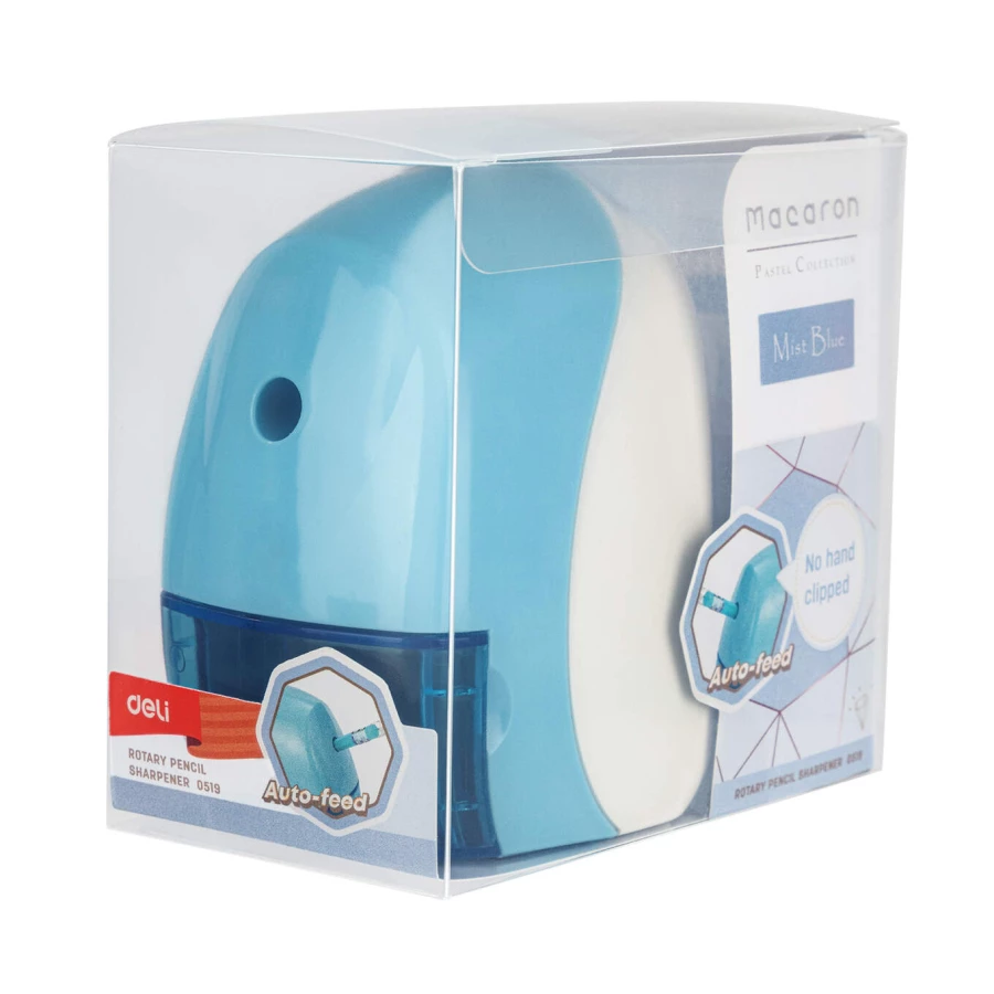 Temperówka na korbkę 0519_BLUE Deli z serii Macron to produkt, który przyciąga uwagę swoim pięknym pastelowym kolorem w odcieniu niebieskiego. Jednak nie tylko wygląd, lecz także wiele funkcjonalności sprawia, że ta temperówka jest idealna dla każdego, kto szuka łatwego i wygodnego sposobu na ostrzenie ołówków.