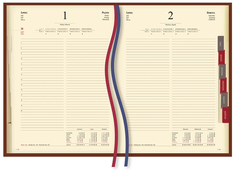 - Uklad kalendarium: 1 dzien - 1 strona + dodatkowe strony po zakonczeniu tygodnia
