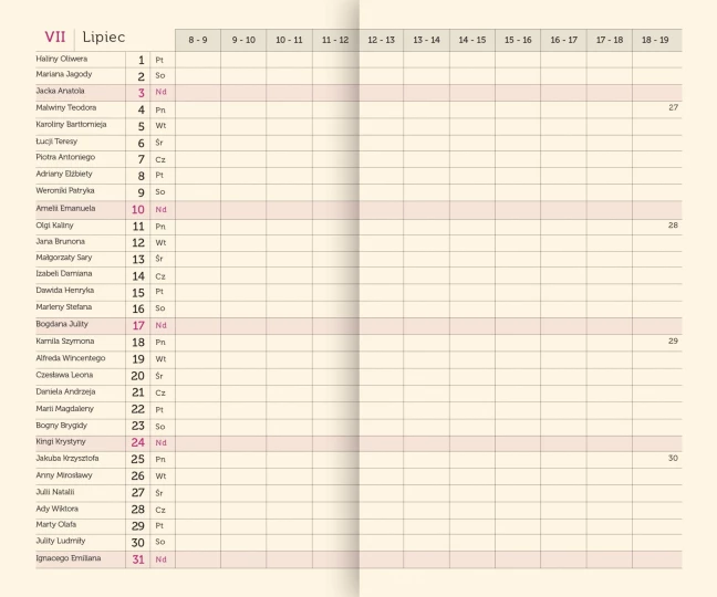 - Uklad kalendarium: 1 miesiąc - 2 strony