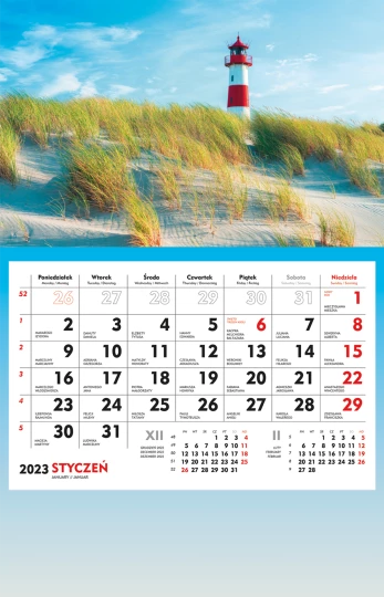 - Uklad kalendarium: 1 miesiąc - 1 kartka