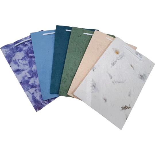 Dekoracyjna torebka wykonana z papieru czerpanego, czyli papieru wytwarzanego tradycyjną metodą ręczną, co nadaje mu unikalną fakturę i estetyczny wygląd.