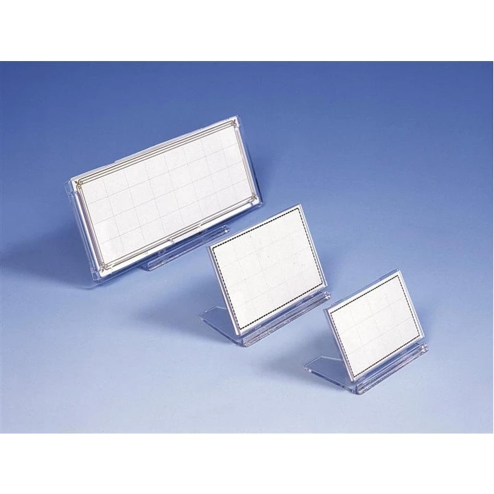 Funkcjonalne wizytowniki stojące_przezroczyste, sztywne tworzywo typu plexi_wygodna, składana podstawka_zastosowanie: konferencje, przyjęcia okolicznościowe, szkolenia, przygotowanie wystaw i ekspozycji, umieszczanie napisów informacyjnych, cen, etykiet itp._dostępne w trzech rozmiarach