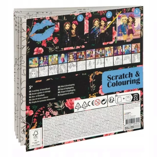 W zestawie rysik do wydrapywania ilustracji, przedstawiających dwie przyjaciółki w różnych sytuacjach.