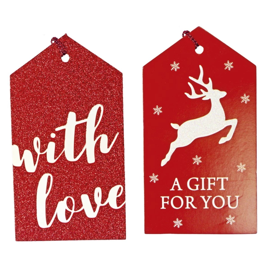 Zawieszki do prezentów wykonane z kartonu. W każdej zawieszce jest wycięty otwór na dowieszenie sznureczka. Tylna strona zawieszki nie posiada nadruku. Tonacja czerwona, wymiary zawieszki: 60x110mm. 20 szt.