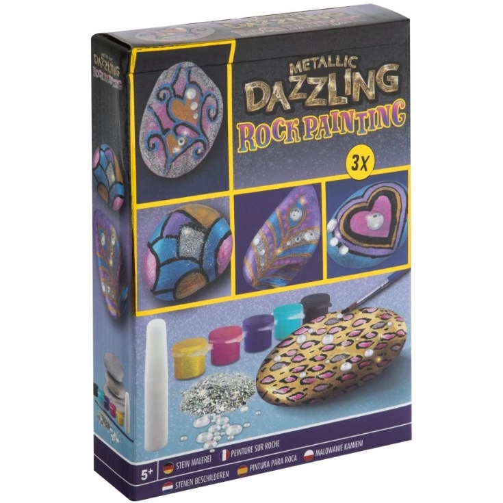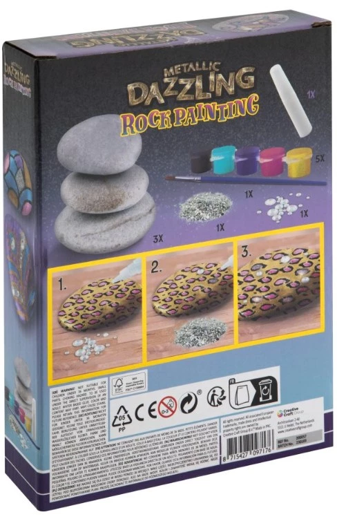 Zawartość fantastycznie nadaje się do udekorowania kamieni i stworzenia z nich istnych dzieł sztuki. Na kamienie można nakleić naklejkę załączone kryształki lub namalować cokolwiek dziecko sobie wymyśli. Wymiary pudełka: 16 x 21 x 4 cm. Odpowiedni dla dzieci w wieku od 5 lat.