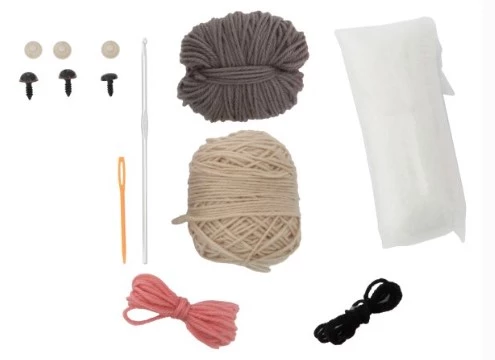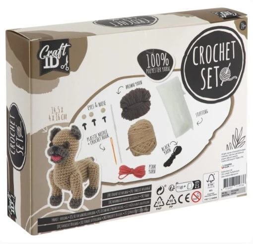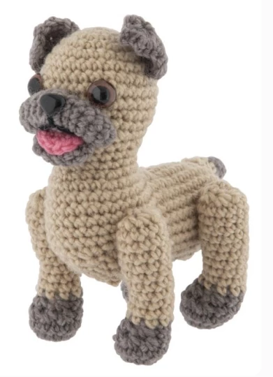Zestaw do szydełkowania Buldog. Po wykonaniu piesek ma wymiar 9,5 cm x 15,5 cm x 16 cm.