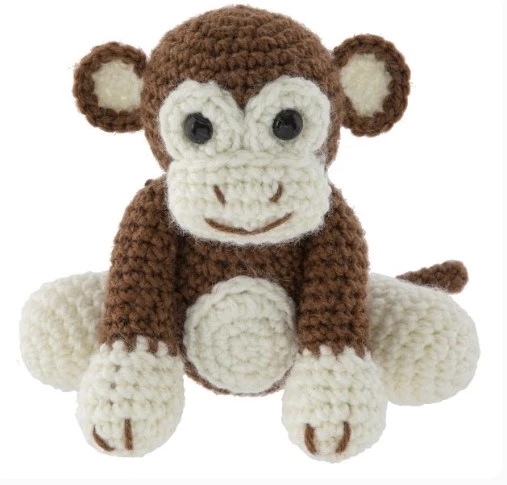 Zestaw do szydełkowania Małpka. Po zrobieniu zabawka ma wymiary15 cm x 9 cm x 13,5 cm.