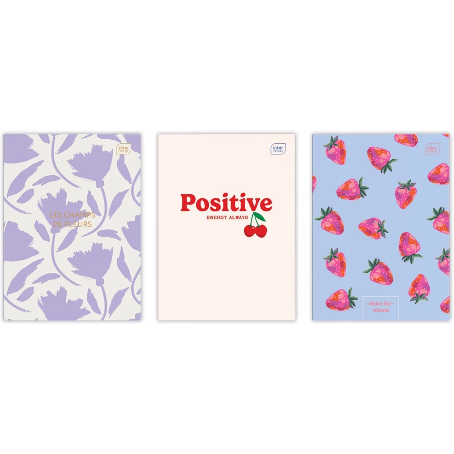 Zeszyty posiadają kredowe, laminowane okładki z piękną grafiką i zadrukiem wewnętrznym. Każdy z nich ma 60 kartek w klasyczną kratkę z czerwonym marginesem – idealne do notatek z różnych przedmiotów.