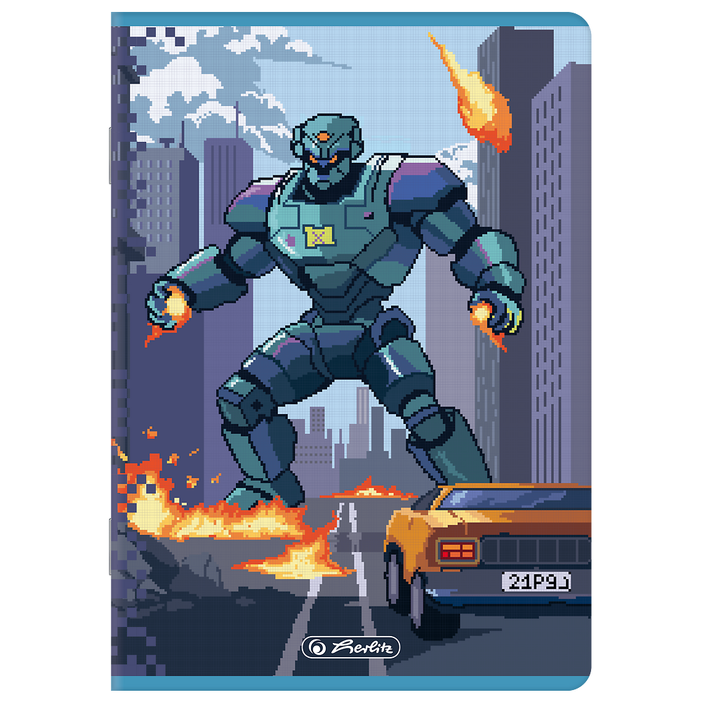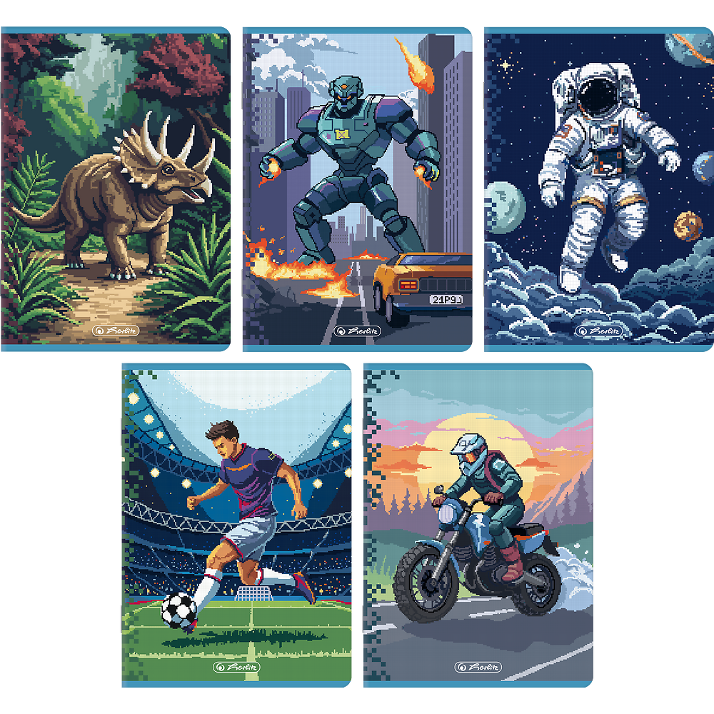 Zeszyty Herlitz Pixel Fun to energetyczna i nowoczesna kolekcja stworzona z myślą o młodszych użytkownikach i wszystkich fanach gier komputerowych oraz pikselowej grafiki retro. Okładki zdobią dynamiczne ilustracje w stylu pixel art, przedstawiające m.in. dinozaura, astronautę, sportowca, robota i motocyklistę – pełne kolorów, ruchu i charakteru. Każdy wzór inspirowany jest światem przygód, sportu i technologii, co czyni kolekcję wyjątkowo atrakcyjną i pobudzającą wyobraźnię. Miękkie, kartonowe okładki zostały wykończone matową folią i uszlachetnione wybiórczym lakierem błysk, który podkreśla detale graficzne i nadaje całości efekt trójwymiarowej głębi. Wewnątrz znajduje się papier o gramaturze 70 g/m², idealny do codziennego pisania i rysowania. Zeszyty Herlitz Pixel Fun to doskonałe połączenie jakości, stylu i młodzieżowego charakteru.